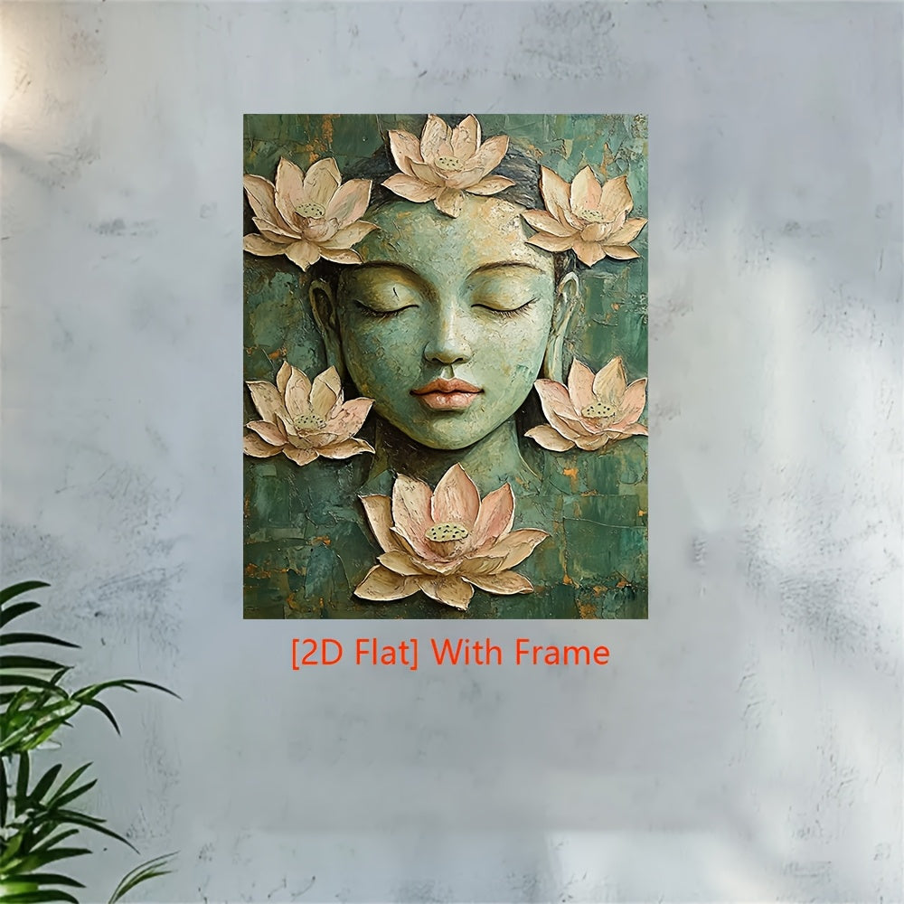 1pc 2D Flat 12.0x16.0inch Serene Buddha Canvas Painting with Wood Frame Green Beige Lotus Meditation Art Boho Spiritual Wall Decor for Home Office Yoga Studio Regenerated Wood Ready to Hang Perfect for Room Decor Yoga Studio Art