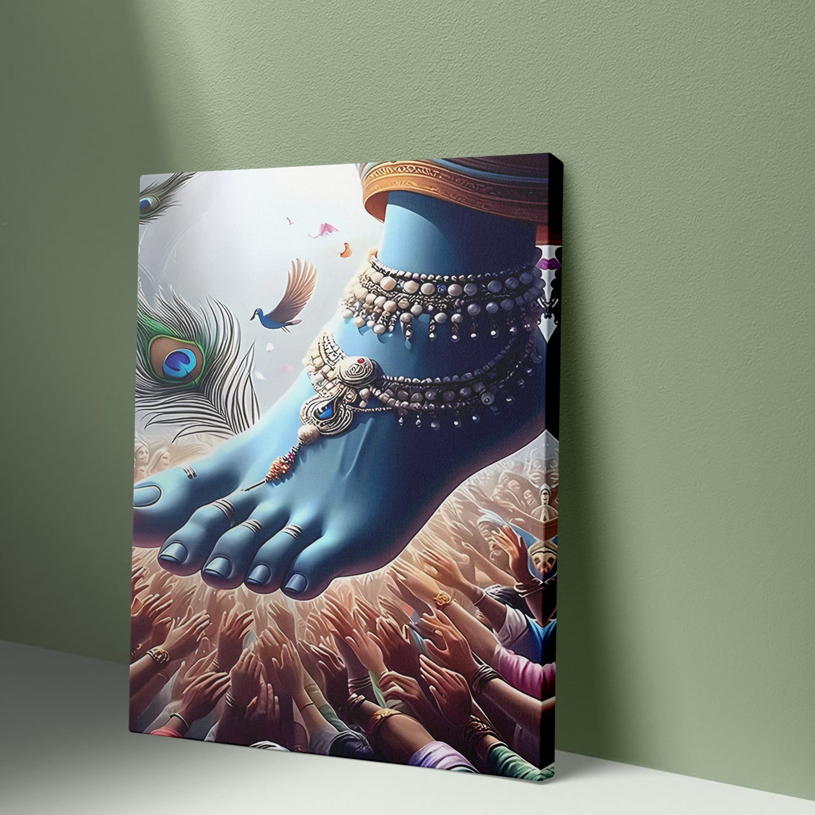 1pc Framed 2D Flat Canvas Painting Krishna Foot Peacock Feather Spiritual Art for Living Room Bedroom Office Yoga Studio Meditation Space Prayer Room Decor