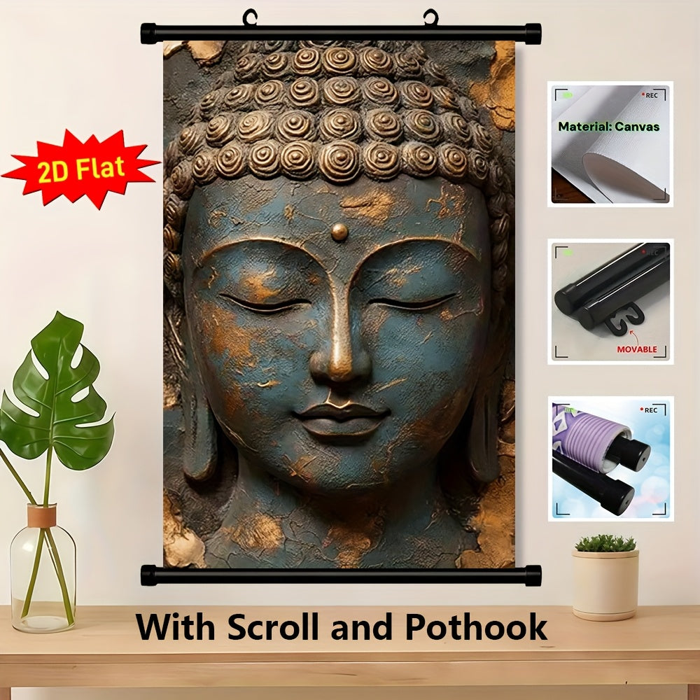 2D Flat 1pc Hanging Scroll Canvas Wall Art Poster | Serene Buddha Face Design in Blue and Brown | Flat Canvas Print for Living Room Office Meditation Spaces | Spiritual Home Decor Gift | Ready to Hang