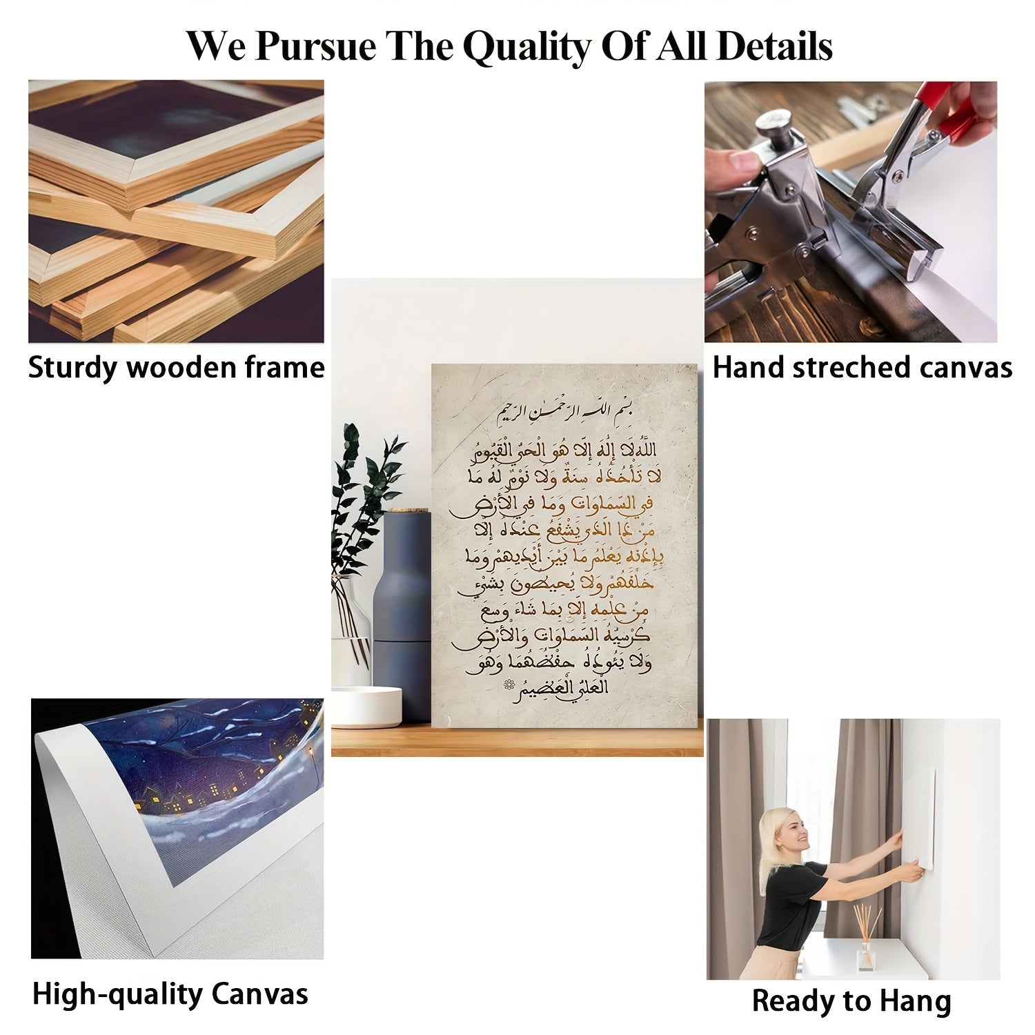 1pc 2D Flat Ayatul Kursi Retro Canvas Frame | Arabic Calligraphy on Beige Background with Golden Wooden Frame | Traditional Islamic Wall Art for Bedroom or Prayer Space | Spiritual Home Décor | 2D Flat