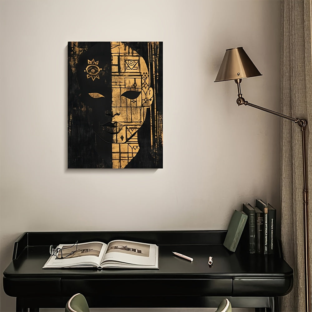 This 2D flat framed canvas print showcases a stylized tribal portrait enriched with abstract Adinkra symbols, combining African heritage with modern minimalist design. The clean geometric forms and thoughtful composition convey wisdom, strength, and identity, creating a visually striking focal point that is both contemporary and meaningful.