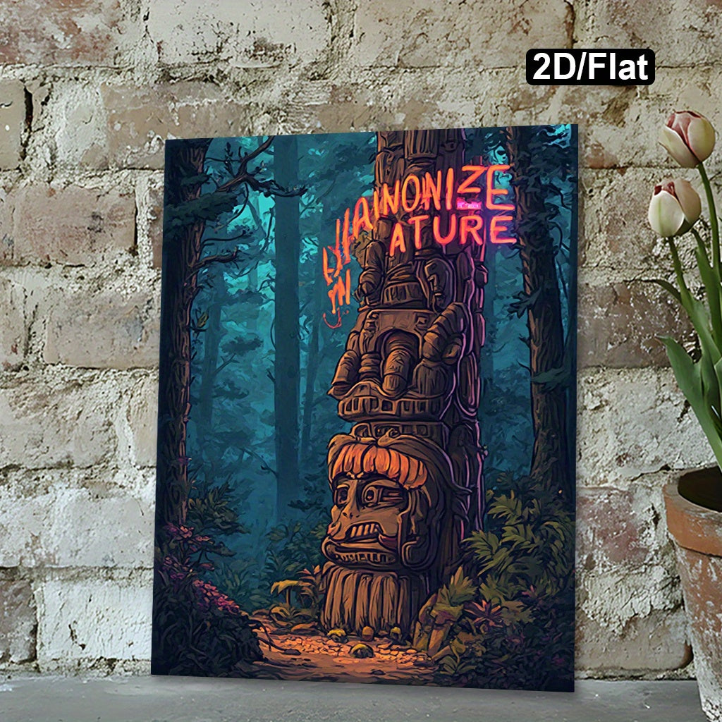 2D Flat Mysterious Totem Pole Forest Canvas Wall Art | Enchanted Woodland Painting with Neon “Harmonize with Nature” Quote | Wooden Framed Modern Nature Decor