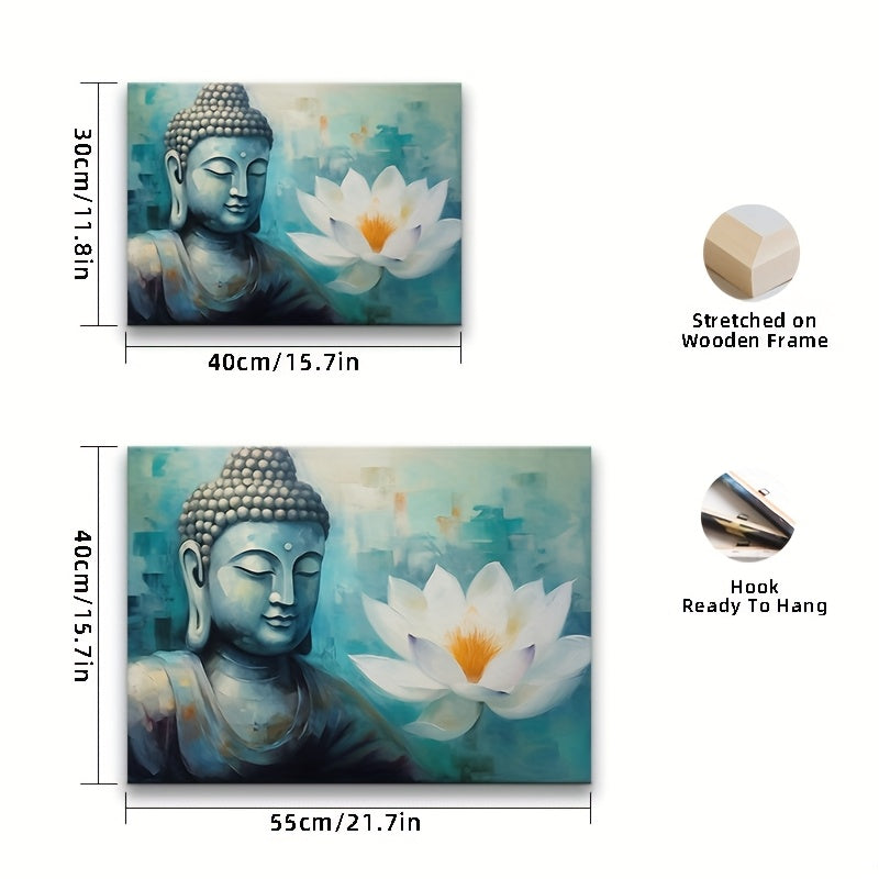 Radiating calm awareness, spiritual balance, and visual serenity, this 2D flat Zen Buddha canvas wall art features a tranquil Buddha in lotus meditation surrounded by a soft blue halo that symbolizes wisdom, clarity, and inner awakening. The presence of the white lotus represents purity, renewal, and peace, creating a harmonious composition that gently anchors the space in stillness and mindfulness. Printed with high quality ink on canvas, the artwork maintains crisp detail and soothing color depth, offering a refined visual experience that supports meditation and relaxation.